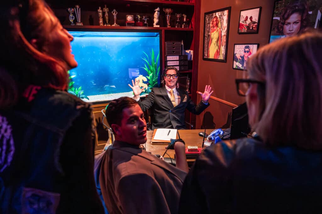 After you’ve chosen your persona (we went with a girlband for our visit), it’s a full-throttle thrust into fame. You begin at the airport lounge before departing London in a private jet on a direct (three-minute) flight to Hollywood. And if you thought in-flight refreshments in business class were anything to gawk at, the FAME*FACTORY private jet offers a chance to “purchase” a luxury villa or a Lamborghini, with a choice to pay with “cash” or “card”. So get the Amex out, this is your chance to flex your unlimited credit card in front of your nearest and dearest.