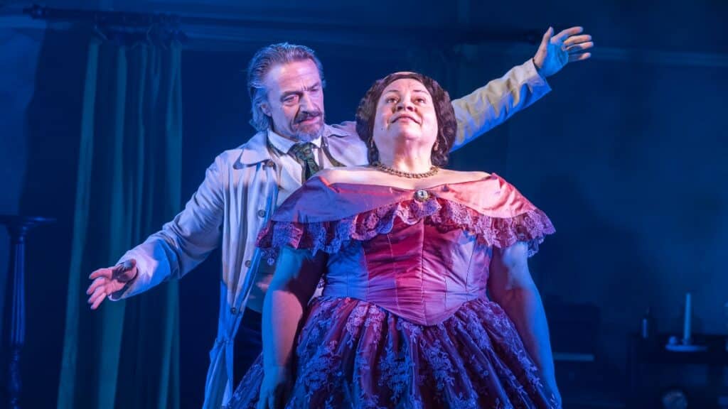 Phillips’ play is much kinder to Mary than history, and not at all kind to Brady. He is sinister puppet master to Mary’s fractured distress, played with a mad scientist energy by Hal Fowler. Keala Settle, just as commanding in Mary’s outlandish pink frocks as she is in her mourning suit, is suitably intimidated, but not cowed. Bronagh Lagan’s direction makes it clear that she is in treacherous territory, reopening a much-broken heart in a space that is liable to transform, to let in strangers, to be visited by ghosts, whilst the dreary green of Anna Kelsey’s set provides little in the way of inspiration or comfort.